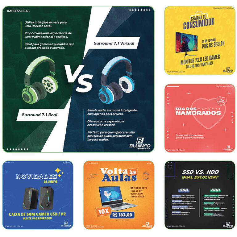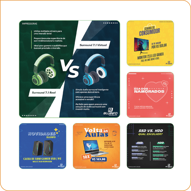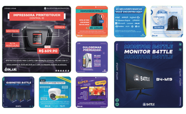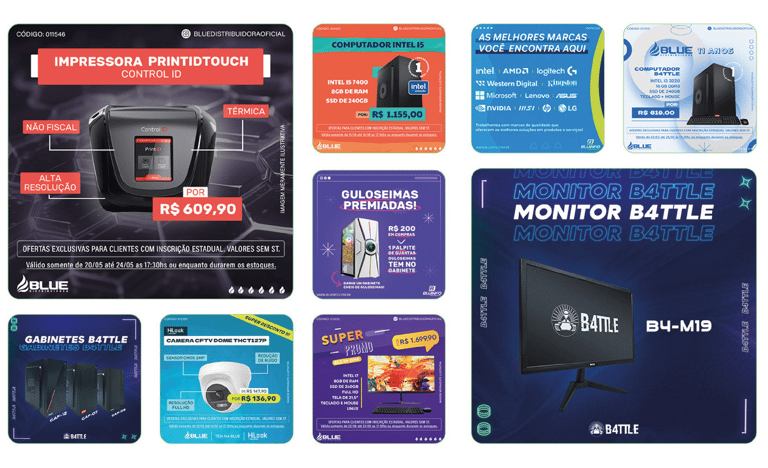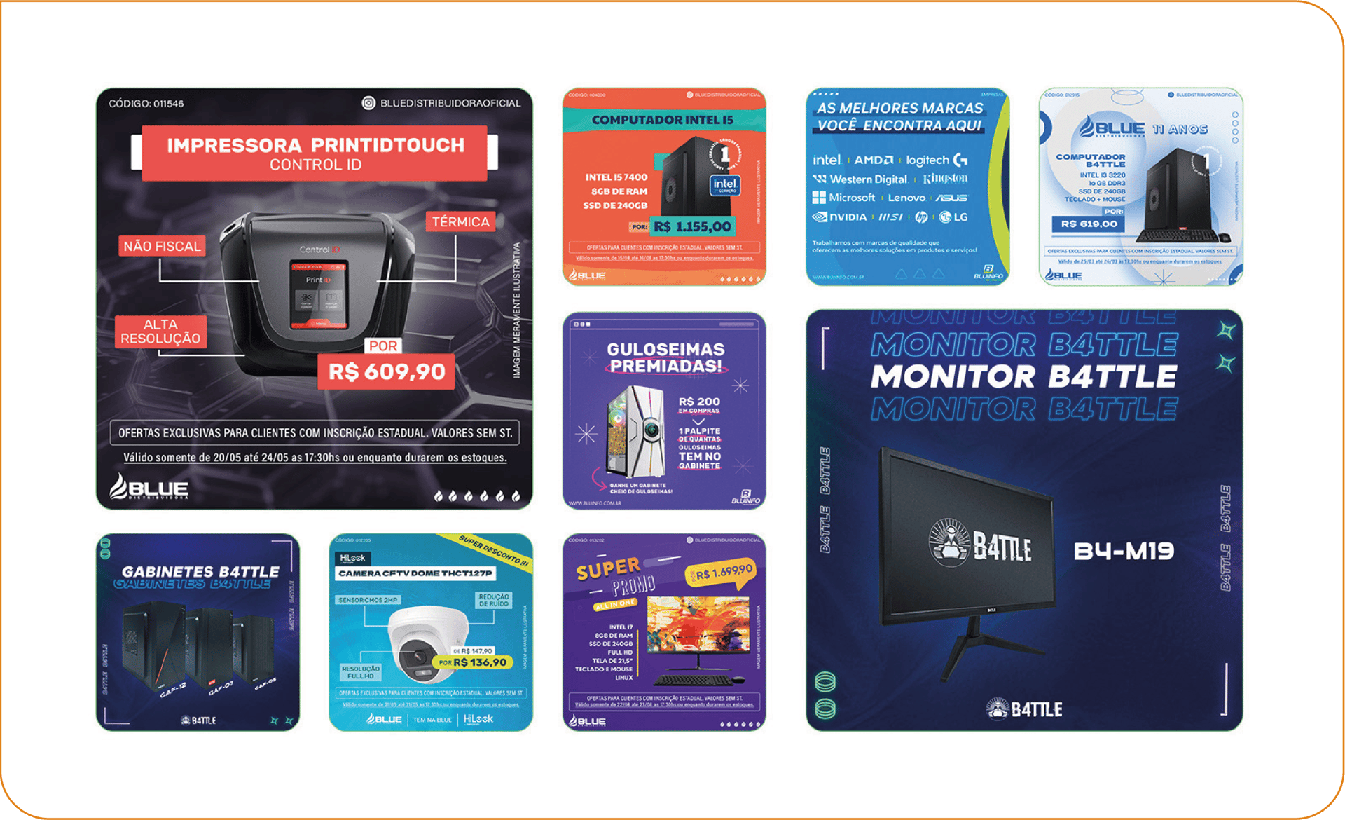 A coordenação de marketing permitiu uma execução impecável nas redes sociais. Cada feed foi projetado para destacar produtos com ofertas atrativas e informações claras, mas respeitando estritamente o manual visual de cada marca. O resultado foi um aumento no engajamento e na conversão, provando que designs modernos e mensagens diretas funcionam tanto para vender placas de vídeo como equipamento tático.