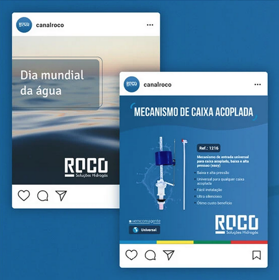 Transformamos a comunicação digital. Em vez de apenas "vender peças", criámos posts educativos que explicam o funcionamento de mecanismos (como caixas acopladas) e celebram datas do setor, posicionando a Roco como uma autoridade técnica útil.